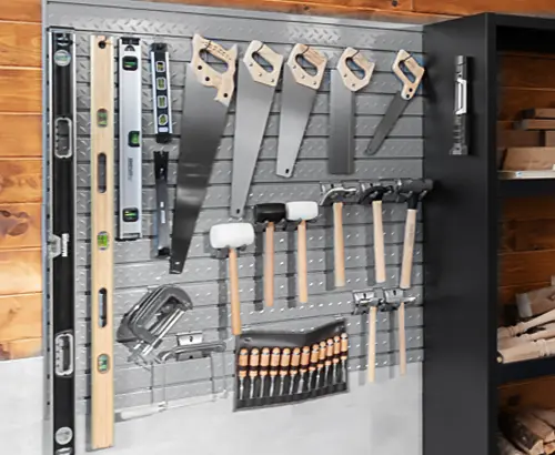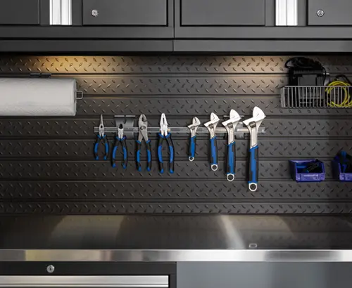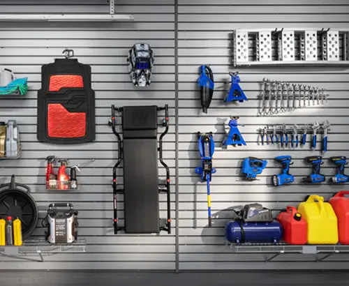 Our slatwall installation services provide one of the most versatile ways to organize your garage. Slatwall panels are mounted directly onto your walls and feature horizontal grooves that hold accessories such as hooks, baskets, shelves, and holders.